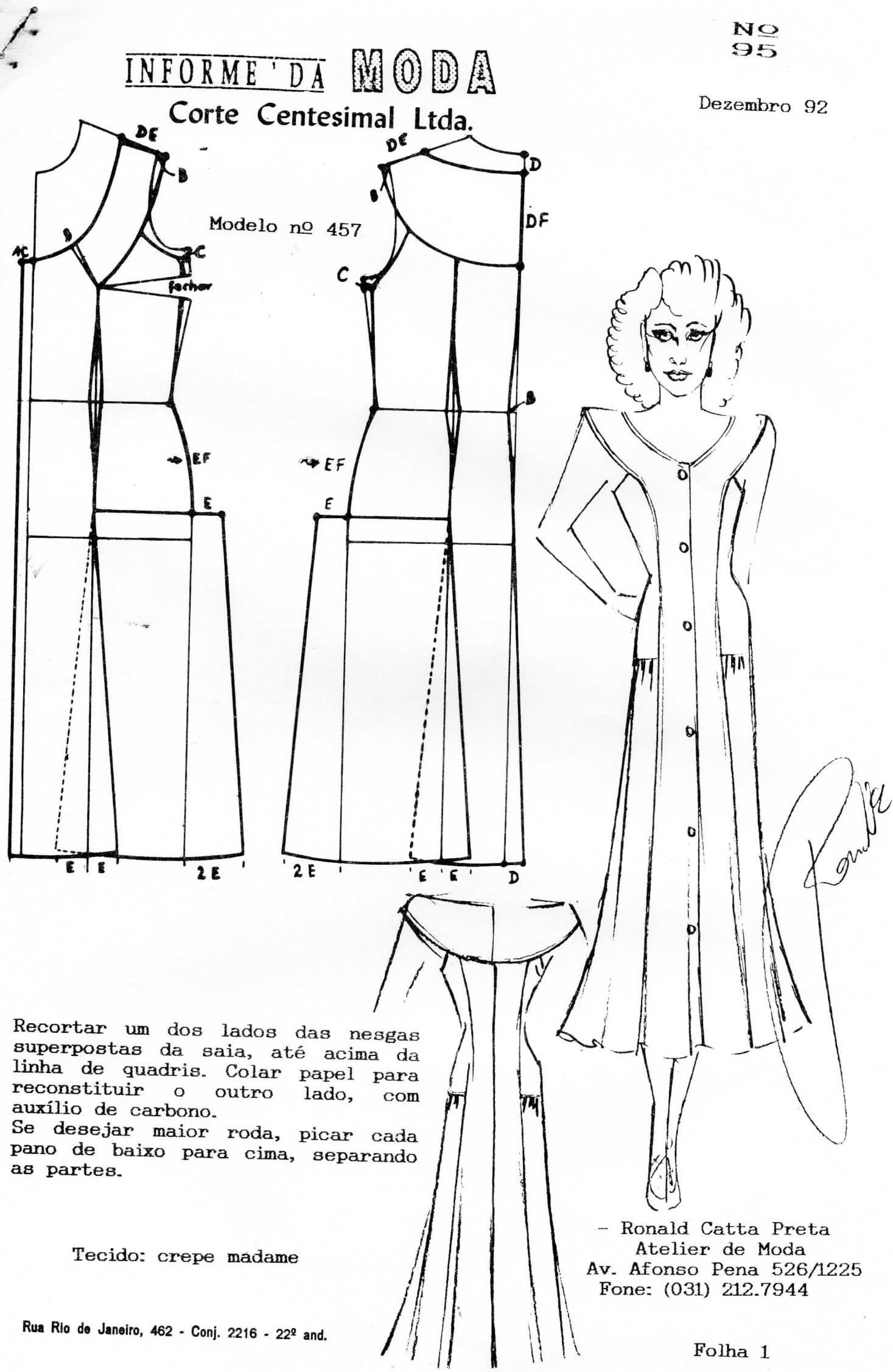 0457 Vestido com alça seguindo o abotoamento frontal e decote em V e saia em nesgas