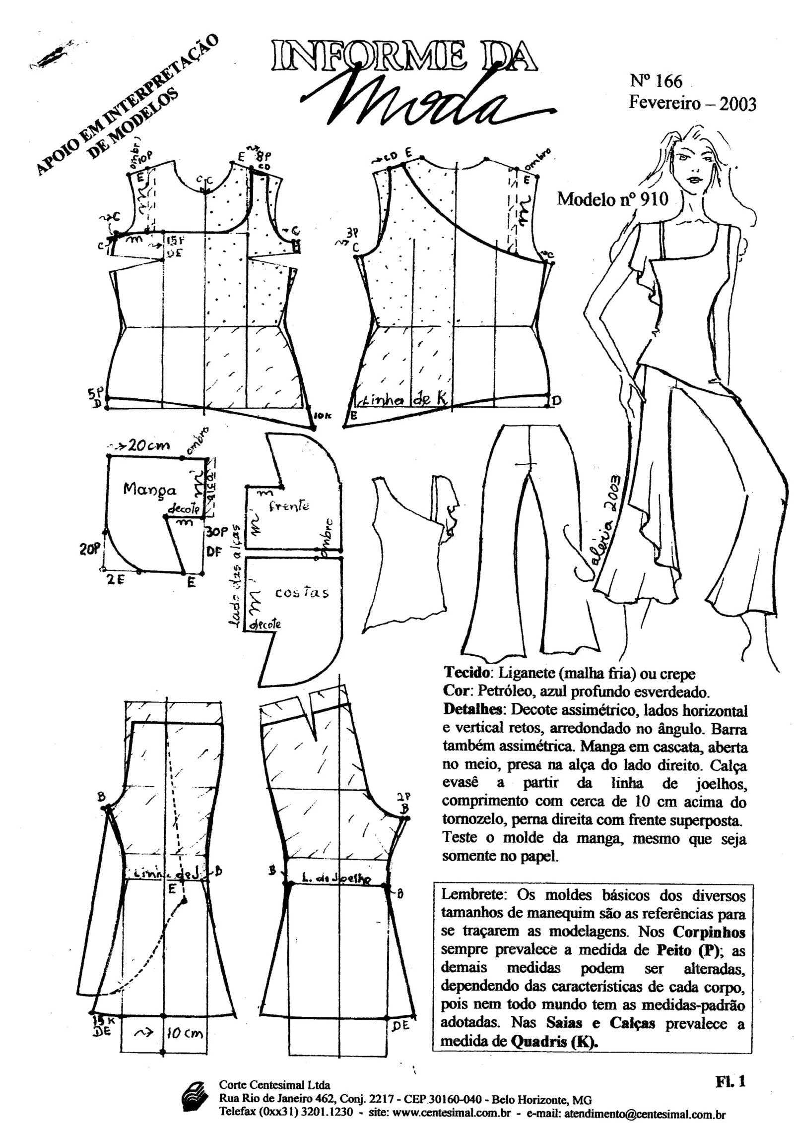 0910 Conjunto de calça evasê a partir da linha de joelhos e blusa com decote assimétrico