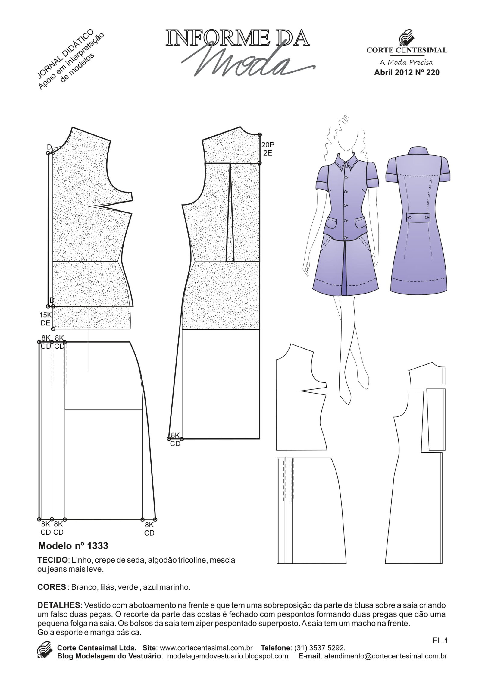 1333 Vestido com abotoamento na frente, com sobreposição da parte da blusa sobre a saia criando um falso duas peças